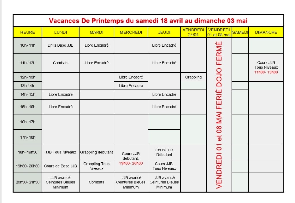 PLANNING DES VACANCES DE PRINTEMPS Publié 7 avril 2026 Par mkteam2019 Partager : Partager sur X(ouvre dans une nouvelle fenêtre) X Partager sur Facebook(ouvre dans une nouvelle fenêtre) Facebook J’aime chargement… Similaire
