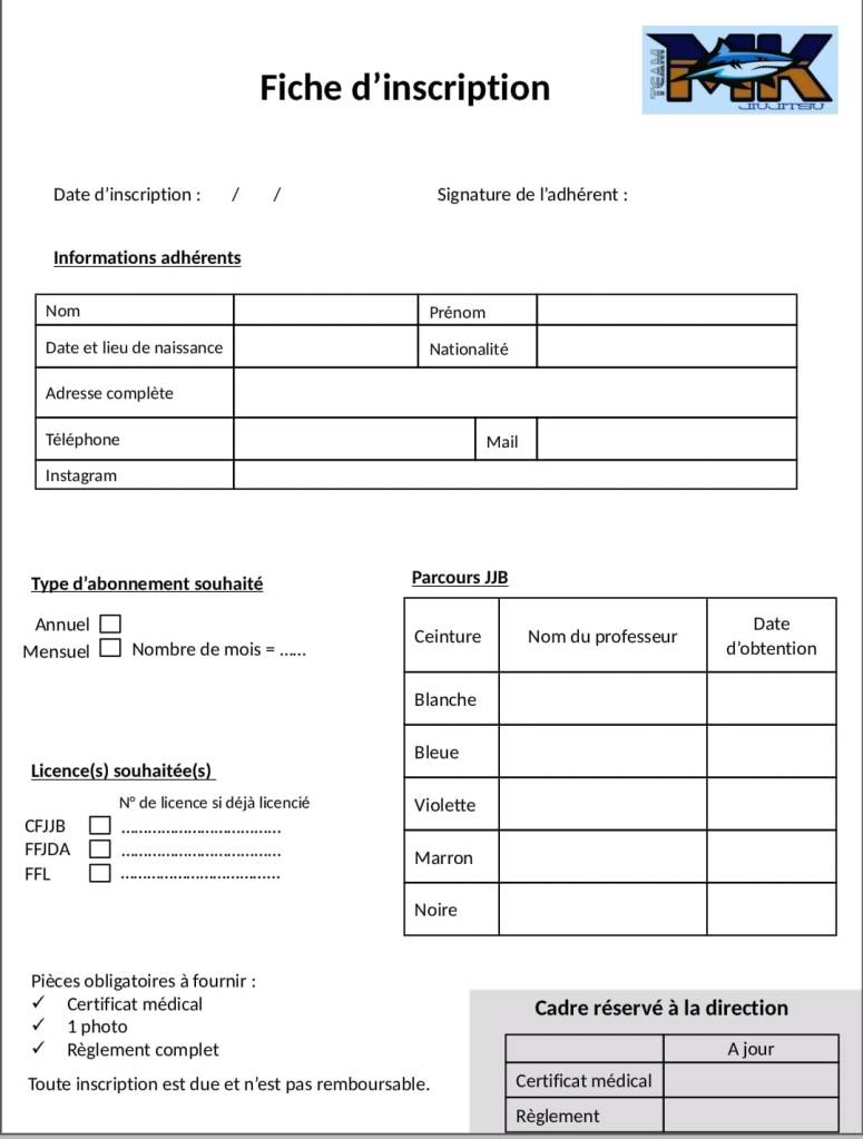 La fiche d’inscription doit être remplie lisiblement et accompagnée d’une photo d’identité ainsi que d’un certificat médical.